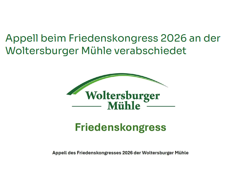 Die Teilnehmenden des Friedenskongresses 2026 am 6. März in der Woltersburger Mühle apellieren angesichts einer drohenden atomaren Aufrüstung an die Bundesregierung, dass Deutschland endlich dem Atomwaffenverbotsvertrag der Vereinten Nationen beitritt und weiterhin einen Beobachter-Status beibehält. Außerdem fordert der Friedenskongress die Bundesregierung auf, bei der anstehenden Überprüfungskonferenz zum Atomwaffensperrvertrag für eine atomare Abrüstung einzutreten.