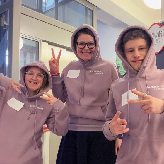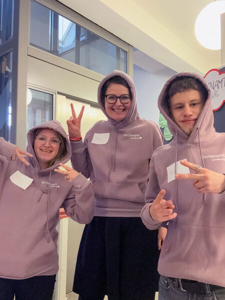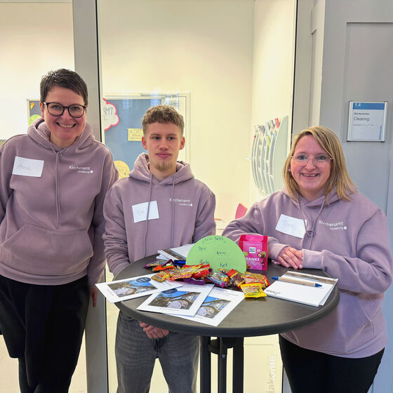 Vom Team sind Dorothee Jacobi (Personalbereich, Ausbilderin, Bildmitte) und Anna Pretzer (Spendenbetreuung, Kasse) sowie die beiden Auszubildenden Linda Stiel und Kjell Barufe vor Ort gewesen. "Wir waren gut sichtbar mit unseren neuen Hoodies und hatten viele nette Gespräche! Als Kirchenamt bilden wir Verwaltungsfachangestellte aus, das ist für viele überraschend.