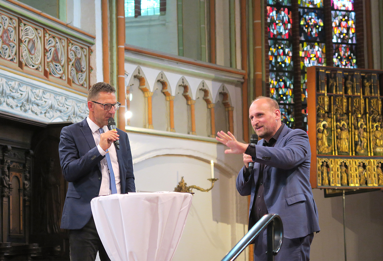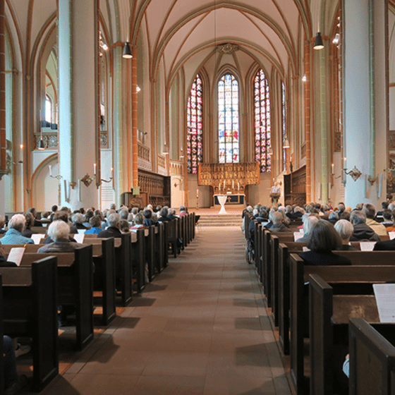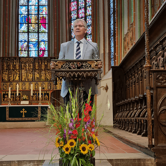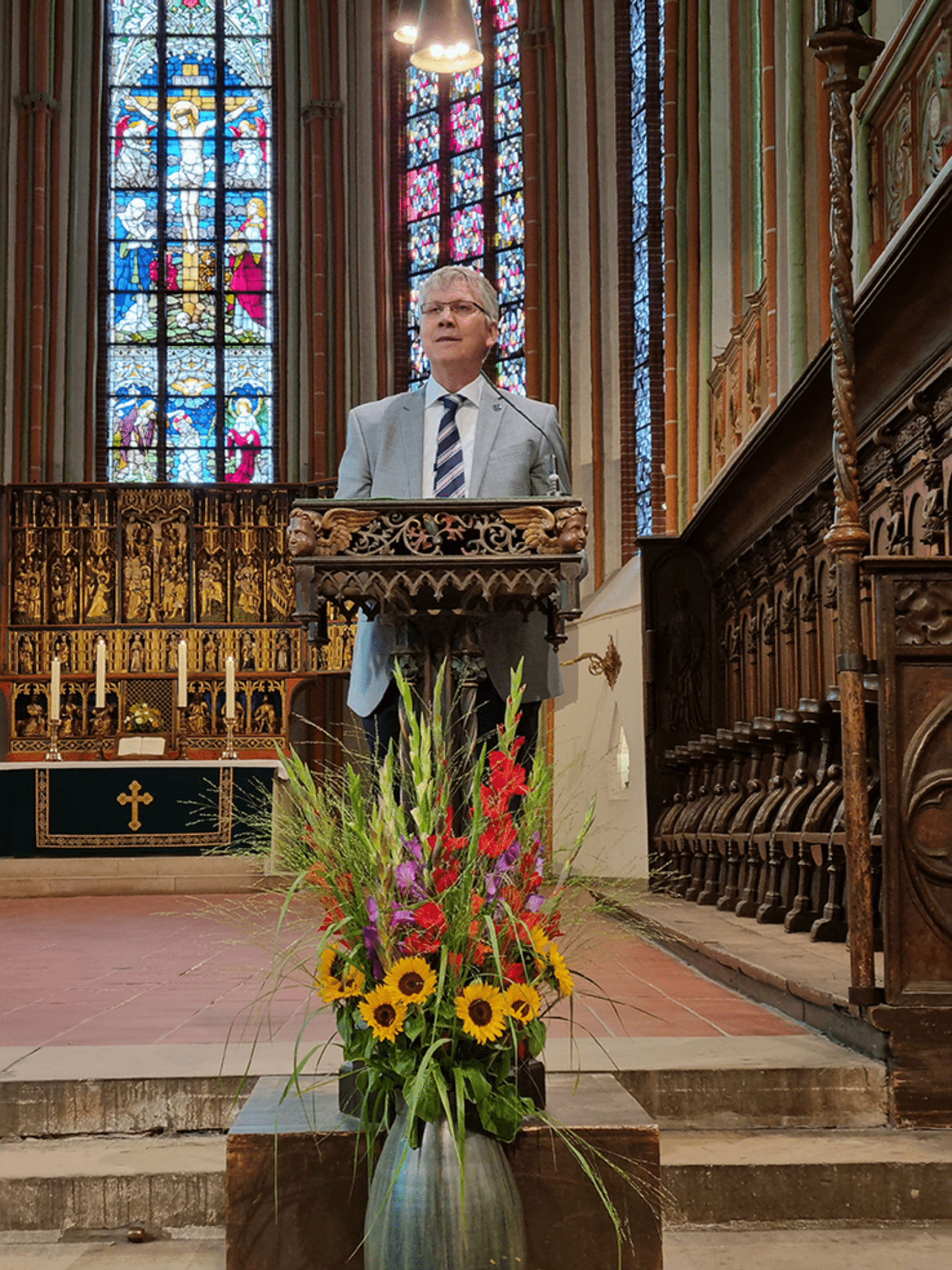 Der Leitende Superintendent Christian Stasch begrüßte die rund 180 Gäste in der St. Johanniskirche Lüneburg. Er lud zum fröhlichen gemeinsamen Singen des „protestantischen Sommerhit schlechthin: Geh aus mein Herz“ ein, begleitet vom Posaunenchor des Kirchenkreises unter der Leitung von Regina Ewe.