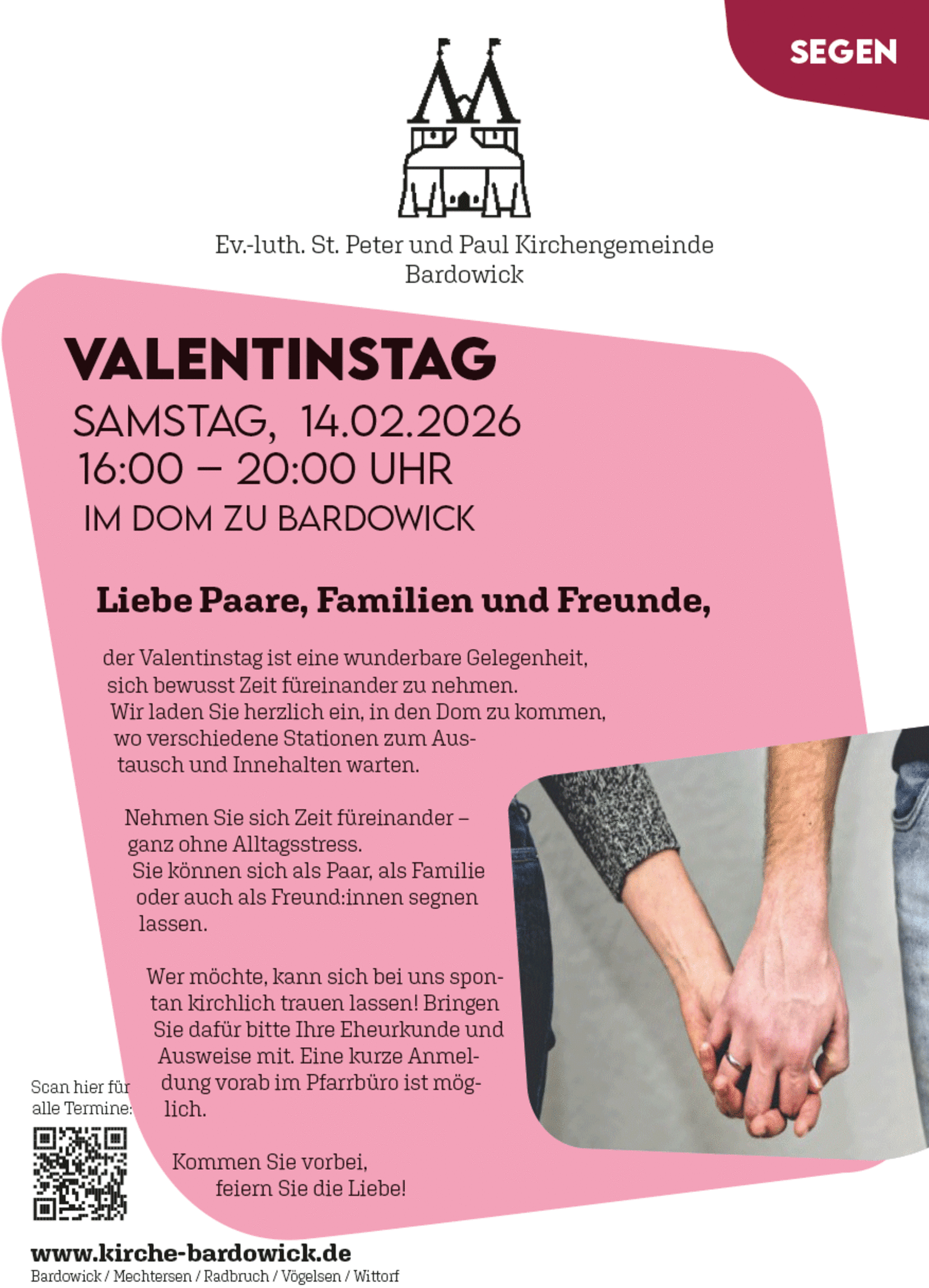 Am Samstag, 14. Februar ist Valentinstag und Paare sind herzlich eingeladen, sich bewusst Zeit füreinander zu nehmen, sich segnen zu lassen – oder sich spontan trauen zu lassen im Dom in der Kirchengemeinde Bardowick.
