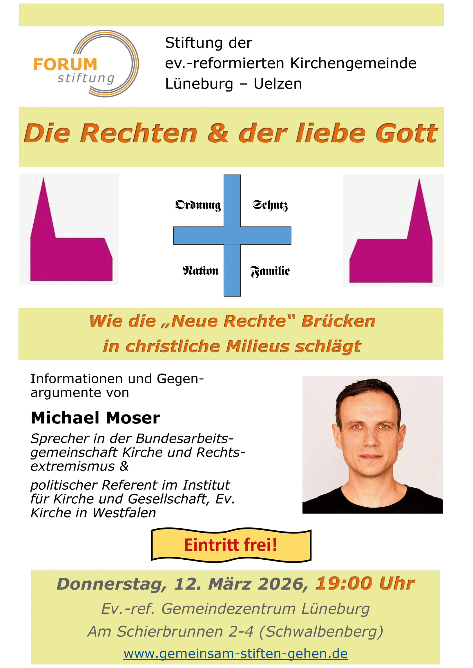die Stiftung der Evangelisch-reformierten Kirchengemeinde Lüneburg-Uelzen ein. Als Referent kommt Michael Moser nach Lüneburg. Er ist wissenschaftlicher Referent für politische Bildung im Themenfeld Rechtsextremismus im Institut für Kirche und Gesellschaft der Evangelischen Kirche von Westfalen. Zugleich ist er einer von sechs Sprechern der Bundesarbeitsgemeinschaft Kirche und Rechtsextremismus. Beginn um 19:00 Uhr